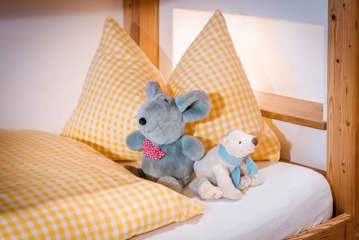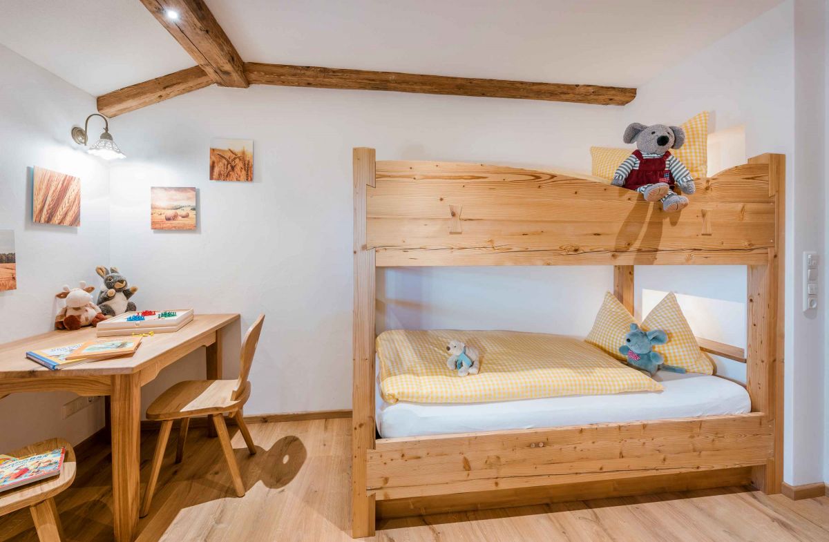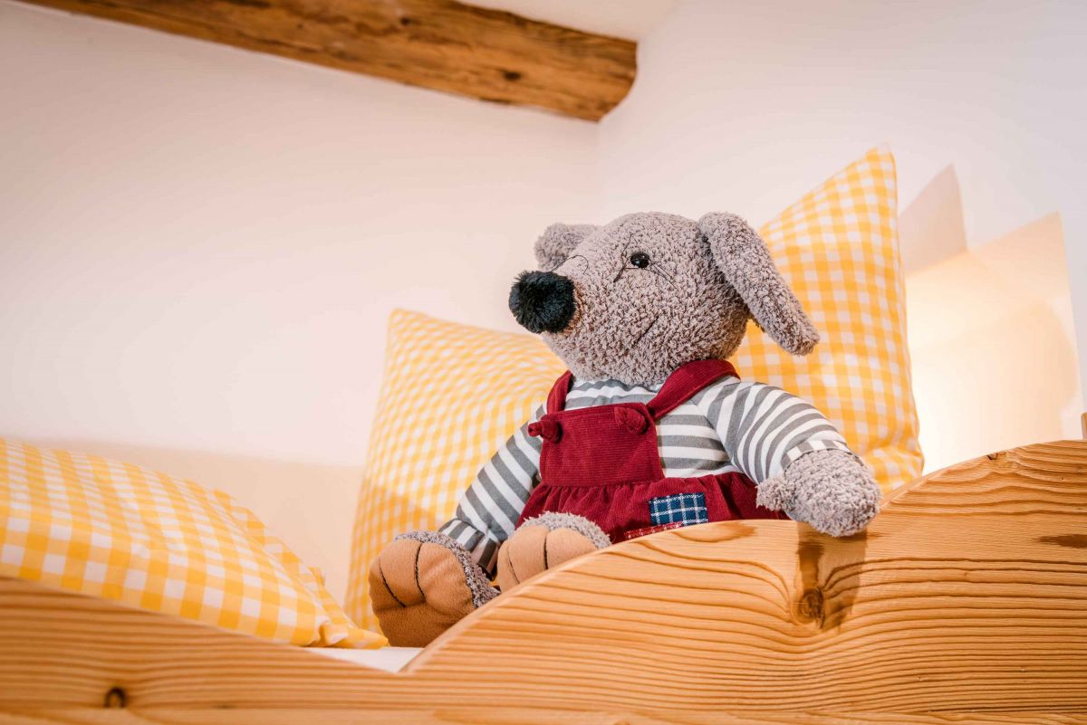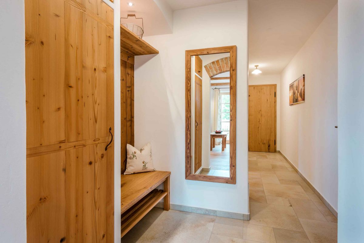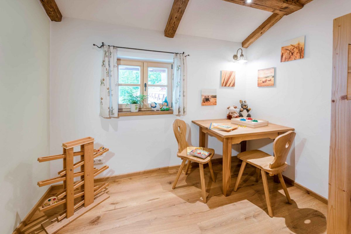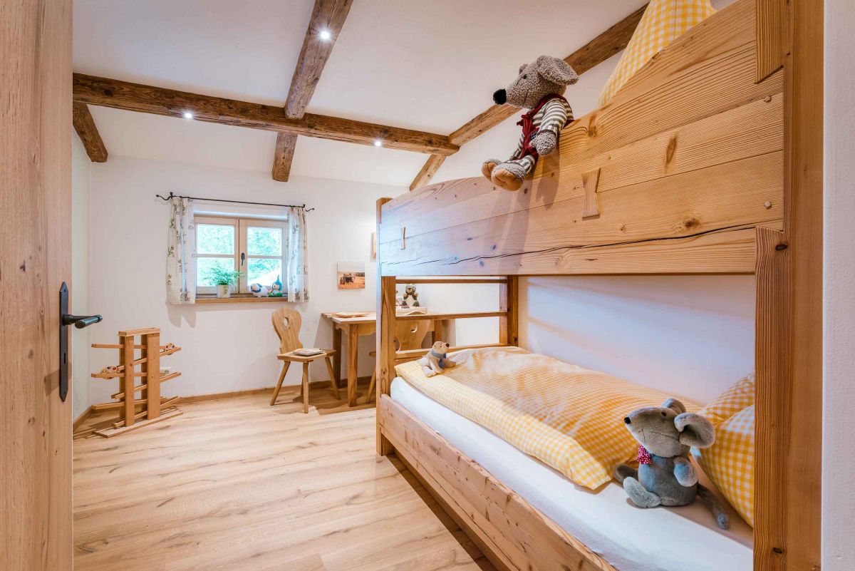 Die 5-Sterne-Luxus-Ferienwohnung "Getreidekasten" bietet mit einer Größe von etwa 80 qm reichlich Platz für bis zu 4 Personen. Die gemütlich eingerichtete Ferienwohnung befindet sich im zweiten Stock des neu erbauten Bauernhauses, ist komfortabel mit einem Aufzug zu erreichen, und besitzt einen Ostbalkon. Sie verfügt über zwei getrennte Schlafzimmer: ein Elternschlafzimmer mit Doppelbett sowie ein Kinderzimmer mit Etagenbett (ein Zustellbett möglich). Die Küche wie auch die übrige Einrichtung wurde von Schreinern angefertigt. Details, Stoffe und Farben wurden von Bäuerin Evi liebevoll zum Wohlfühlen ausgewählt.