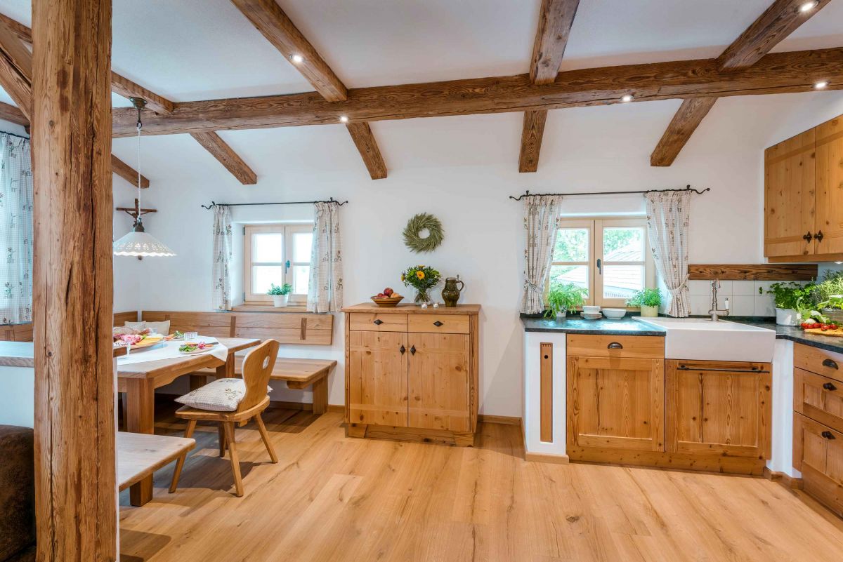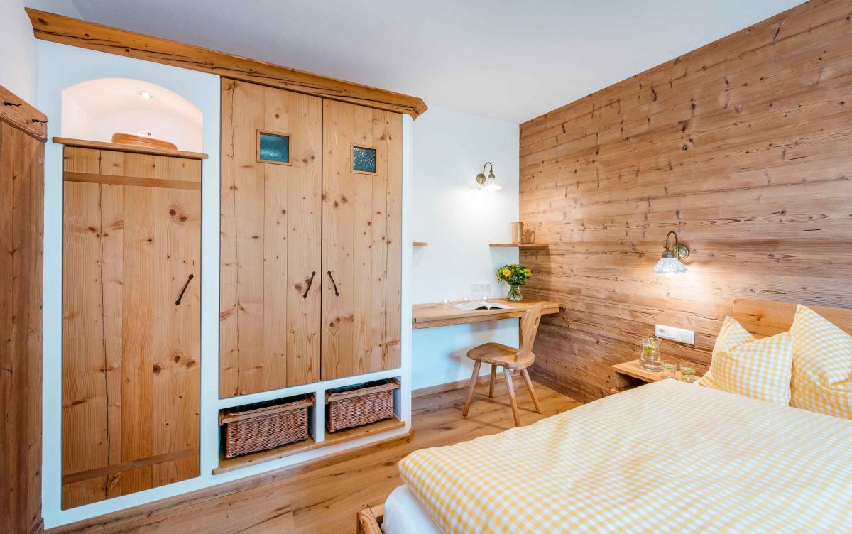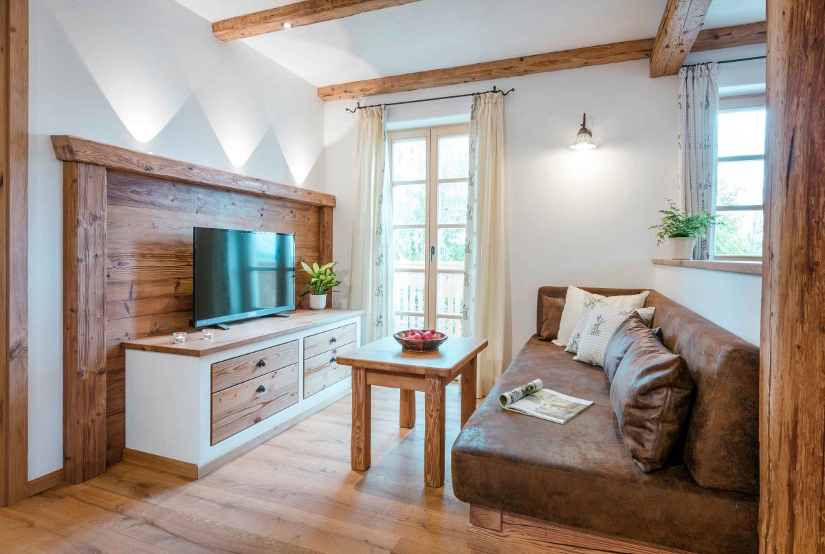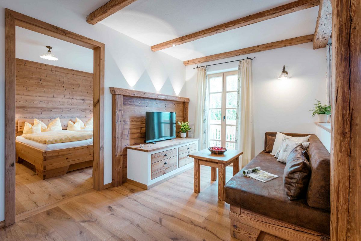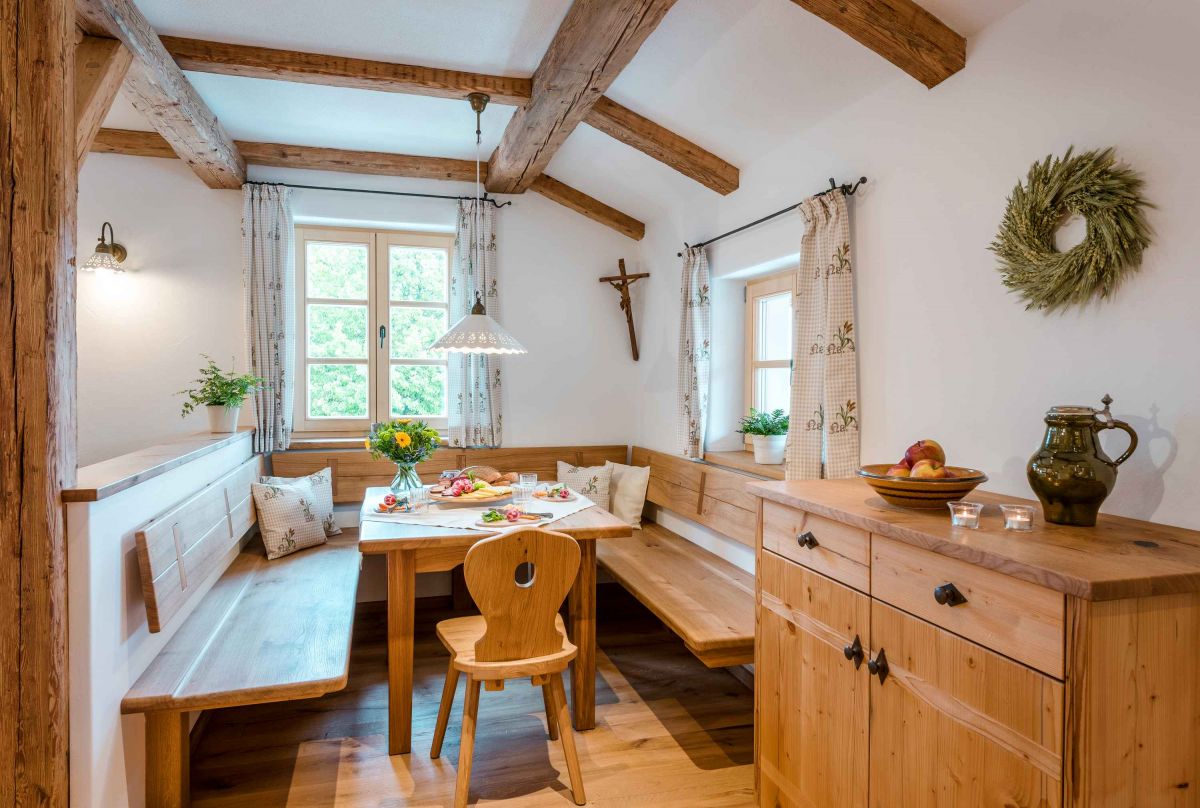 Die 5-Sterne-Luxus-Ferienwohnung "Getreidekasten" bietet mit einer Größe von etwa 80 qm reichlich Platz für bis zu 4 Personen. Die gemütlich eingerichtete Ferienwohnung befindet sich im zweiten Stock des neu erbauten Bauernhauses, ist komfortabel mit einem Aufzug zu erreichen, und besitzt einen Ostbalkon. Sie verfügt über zwei getrennte Schlafzimmer: ein Elternschlafzimmer mit Doppelbett sowie ein Kinderzimmer mit Etagenbett (ein Zustellbett möglich). Die Küche wie auch die übrige Einrichtung wurde von Schreinern angefertigt. Details, Stoffe und Farben wurden von Bäuerin Evi liebevoll zum Wohlfühlen ausgewählt.