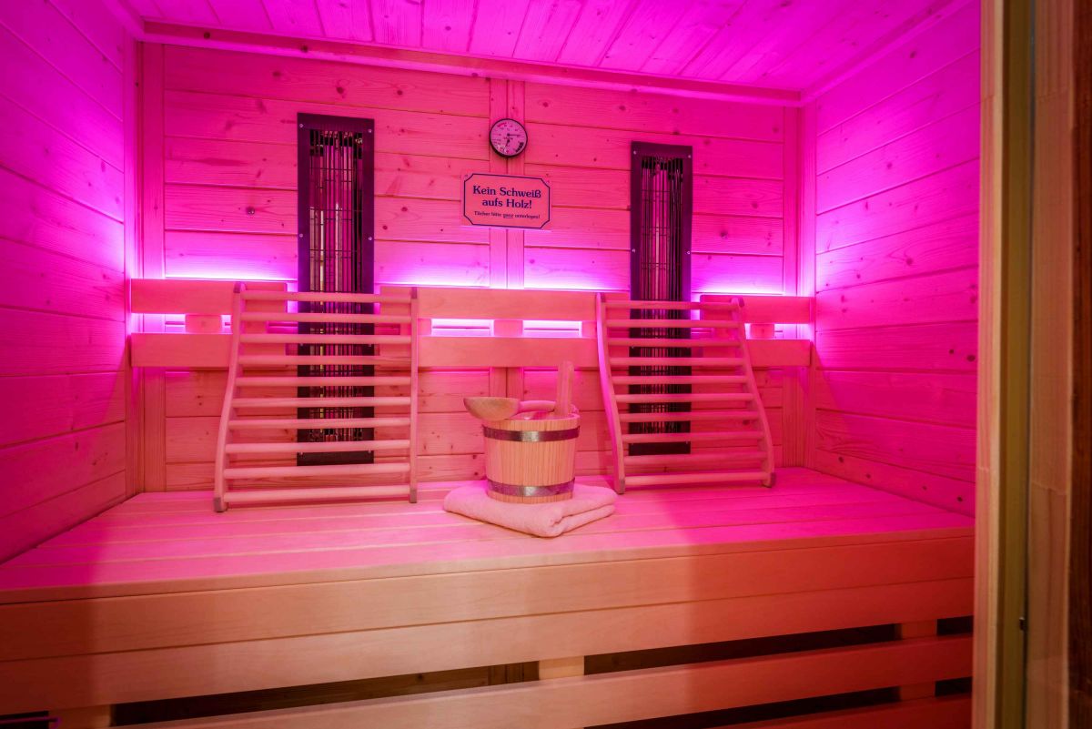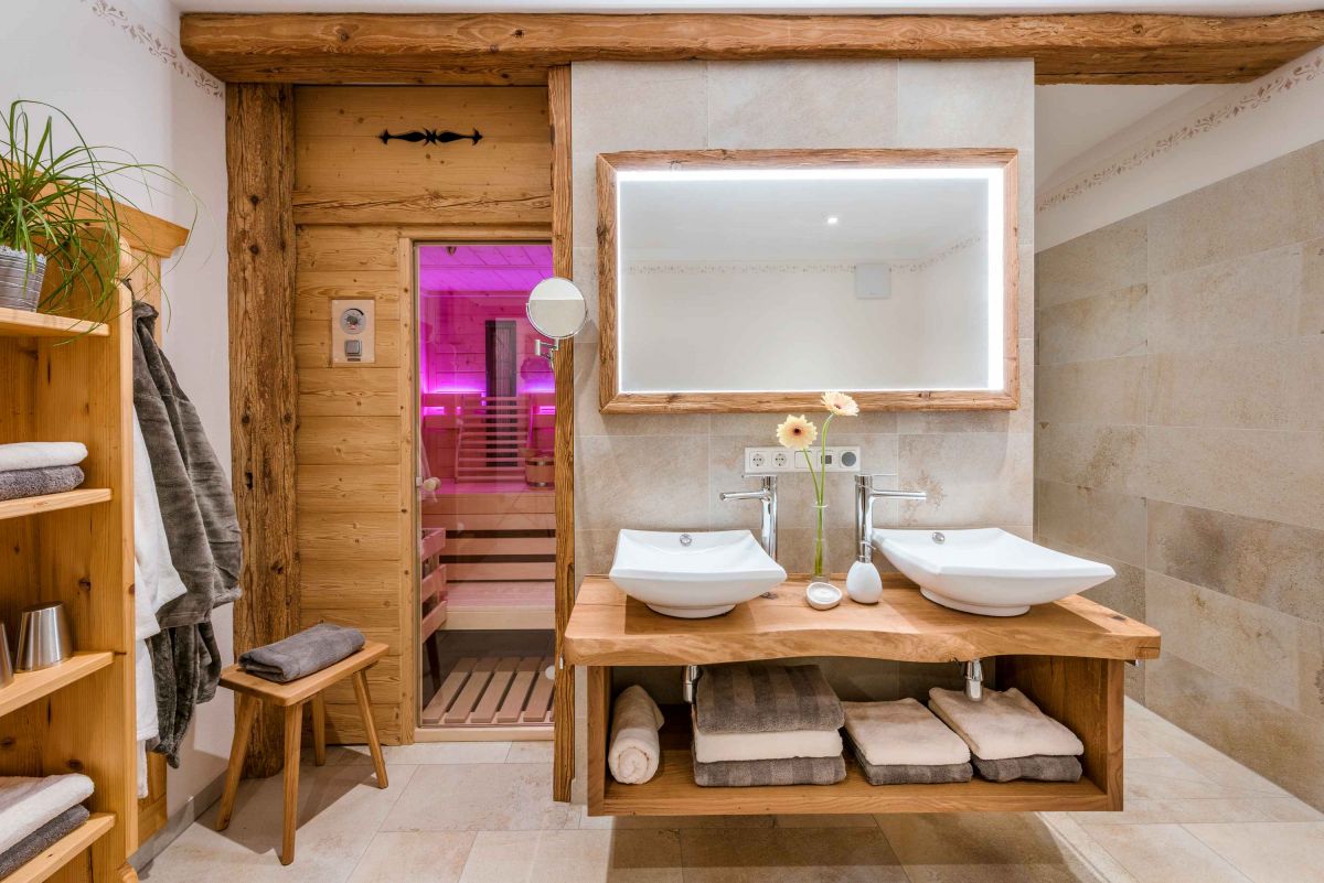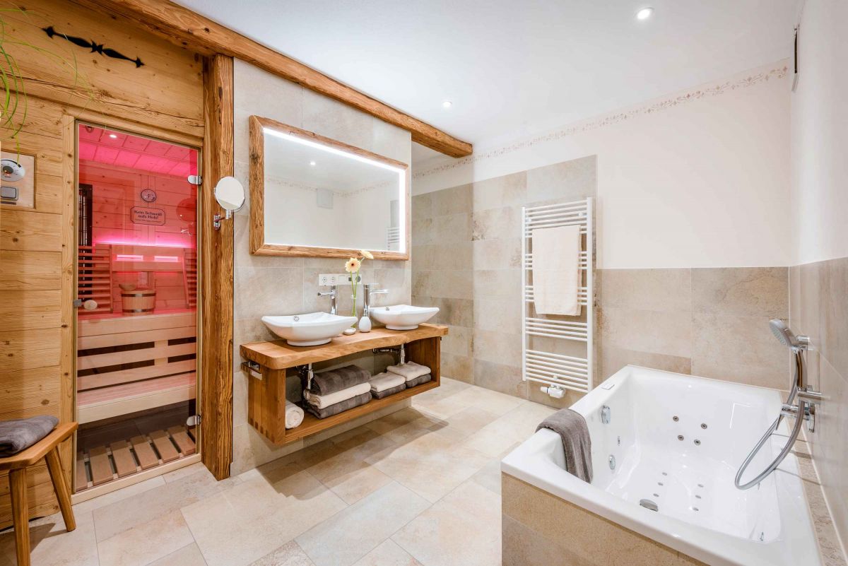 - 1 Badezimmer mit Regendusche, finnischer Sauna inklusive VITAL-light-Infrarot-ABC-Strahler und Farblicht-Therapie, Whirlwanne mit Sprudel- und Massagedüsen, 2 Waschbecken, Fön und Schminkspiegel, Handtuchwärmer