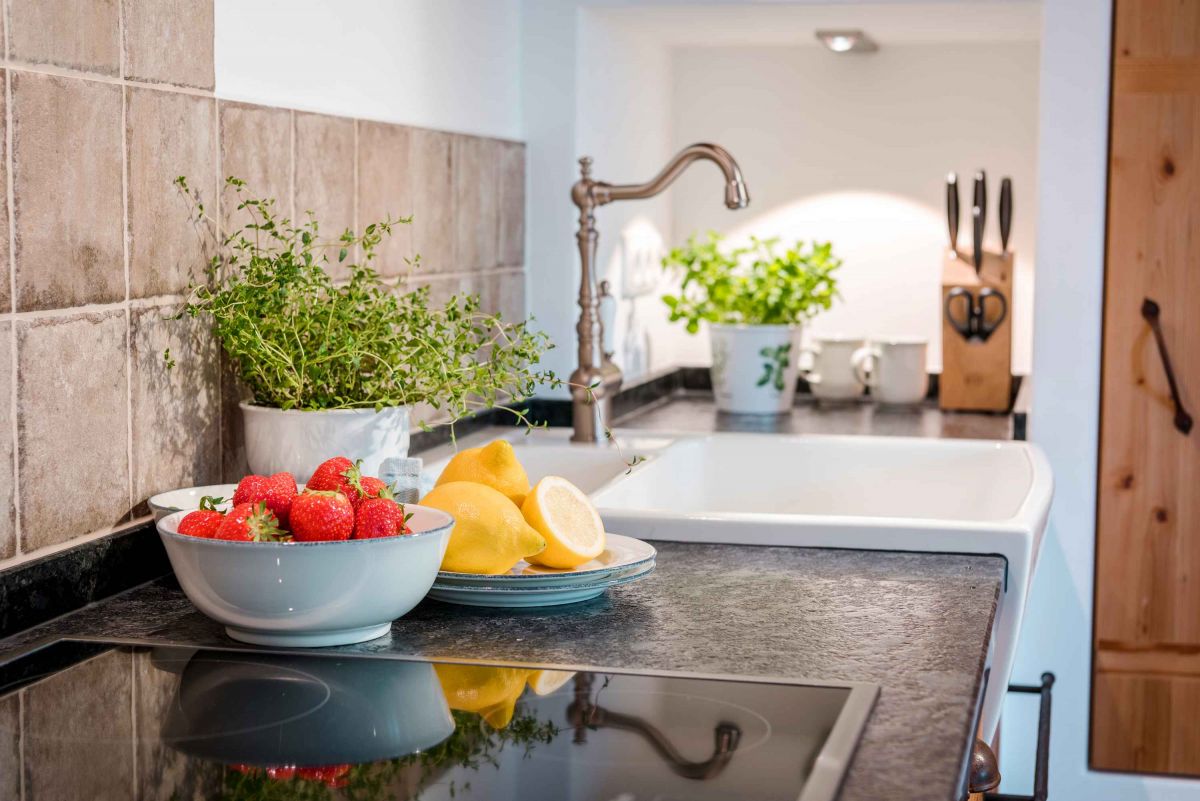 - komplett ausgestattete Küche mit E-Herd, Backofen, Kühlschrank mit Gefrierfach, Mikrowelle, Geschirrspüler, Kaffeemaschine, Wasserkocher, Eierkocher, Handrührgerät, Stabmixer und Toaster